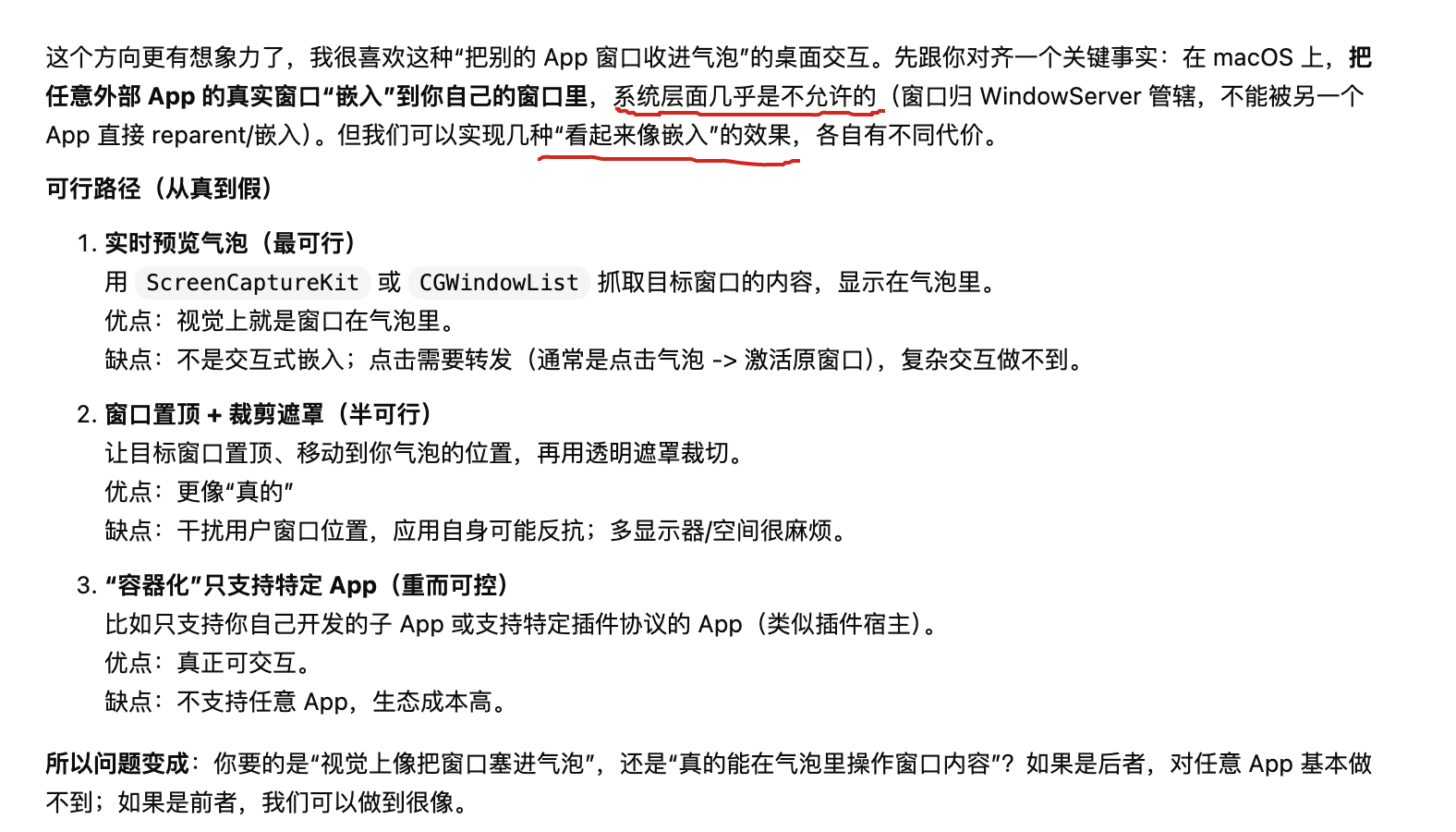 你要的是”视觉上像把窗口塞进气泡”,还是”真的能在气泡里操作窗口内容”?如果是前者,我们可以做到很像。